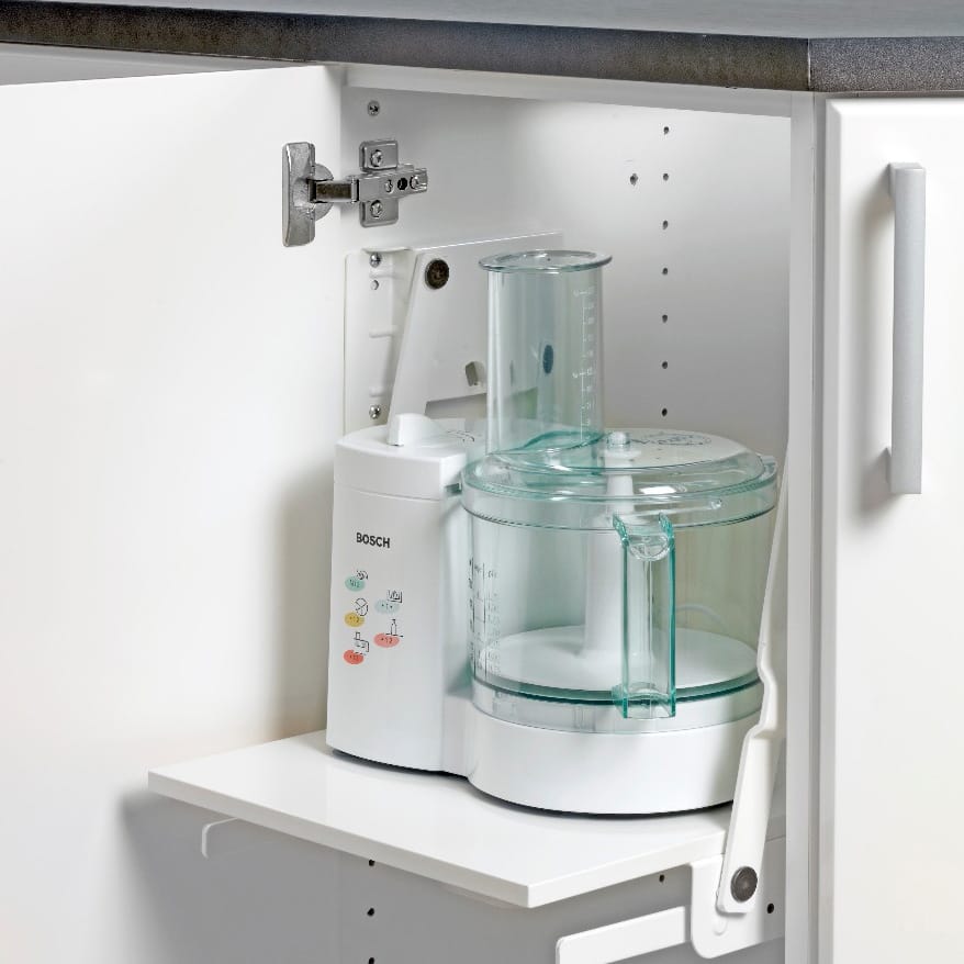 Hrærivélalyfta frá Pelly er hagnýt lausn til að geyma hrærivélar og önnur þyngri eldhústæki inni í skáp og lyfta þeim auðveldlega upp í vinnuhæð þegar á þarf að halda.