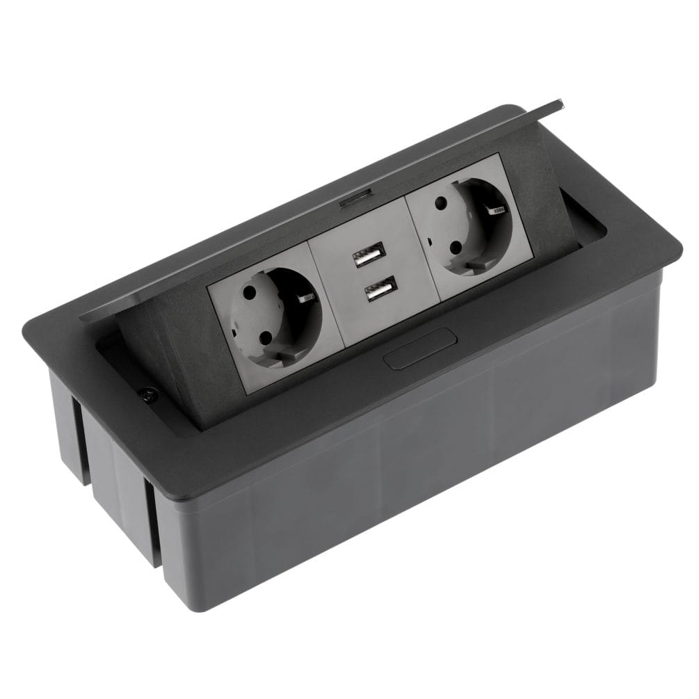 Snyrtileg innfelld tengieining fyrir borðplötur og vinnuaðstöðu. Með Schuko-rafmagnstengjum og USB-A hleðslutengjum, ásamt 1,5 m snúru. Hentar vel í skrifborð, fundarborð og eldhús þar sem þörf er á snyrtilegri og aðgengilegri rafmagnslausn.