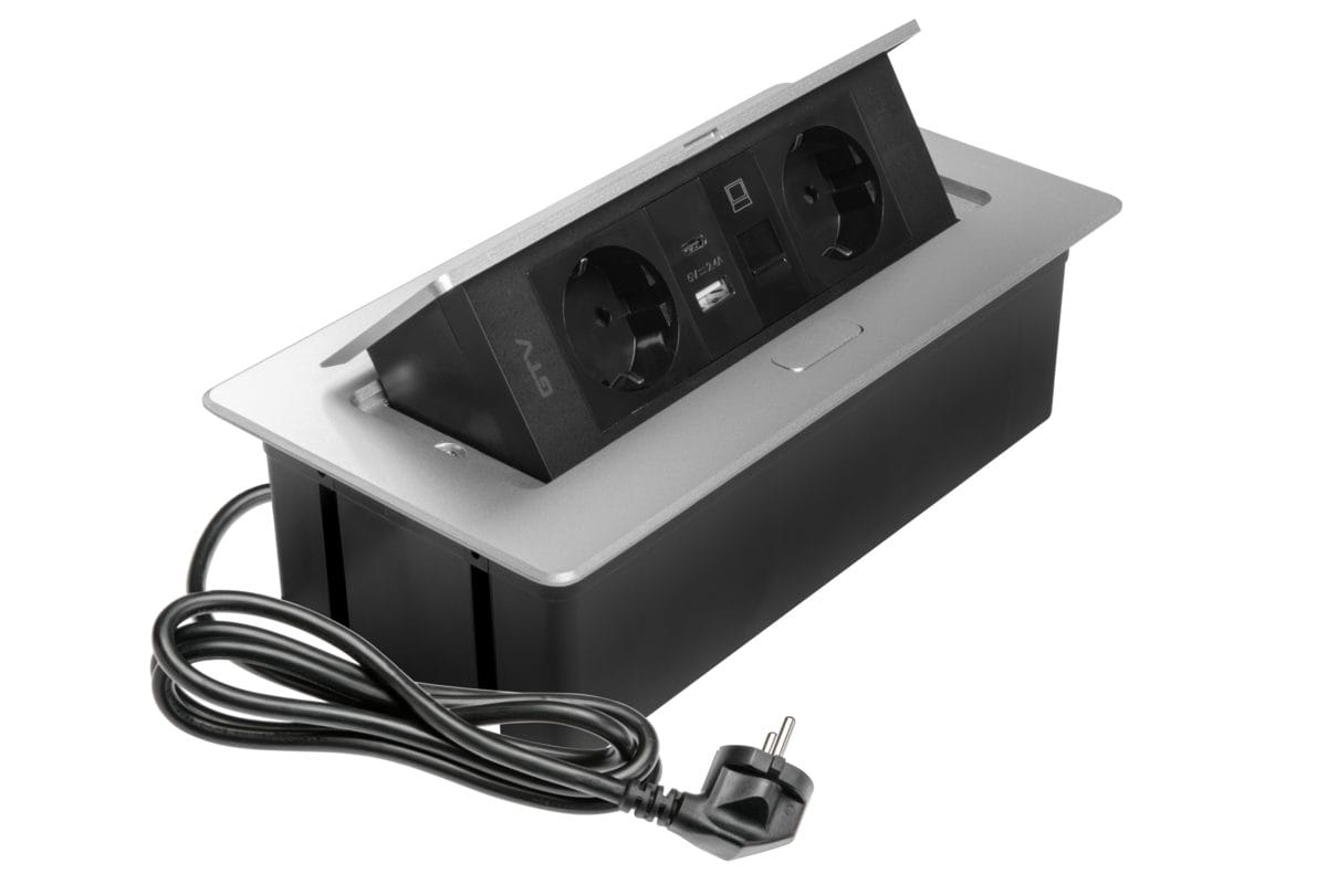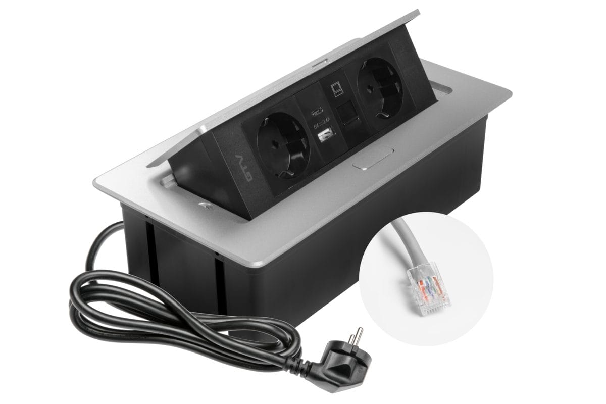 Praktísk og snyrtileg innfelld tengieining fyrir borðplötur og vinnuaðstöðu. Með 2 rafmagnstengjum, USB A+C hleðslu og RJ45 nettengingu, ásamt 1,5 m snúru. Hentar vel í skrifborð, fundarborð og eldhús.