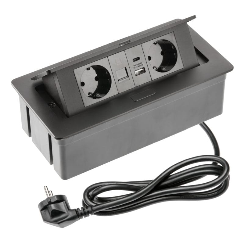 Snyrtileg og fjölhæf innfelld tengieining fyrir borðplötur og vinnuaðstöðu. Með 2 rafmagnstengjum, USB A+C hleðslu og RJ45 nettengingu, ásamt 1,5 m snúru. Hentar vel í skrifborð, fundarborð og eldhús.