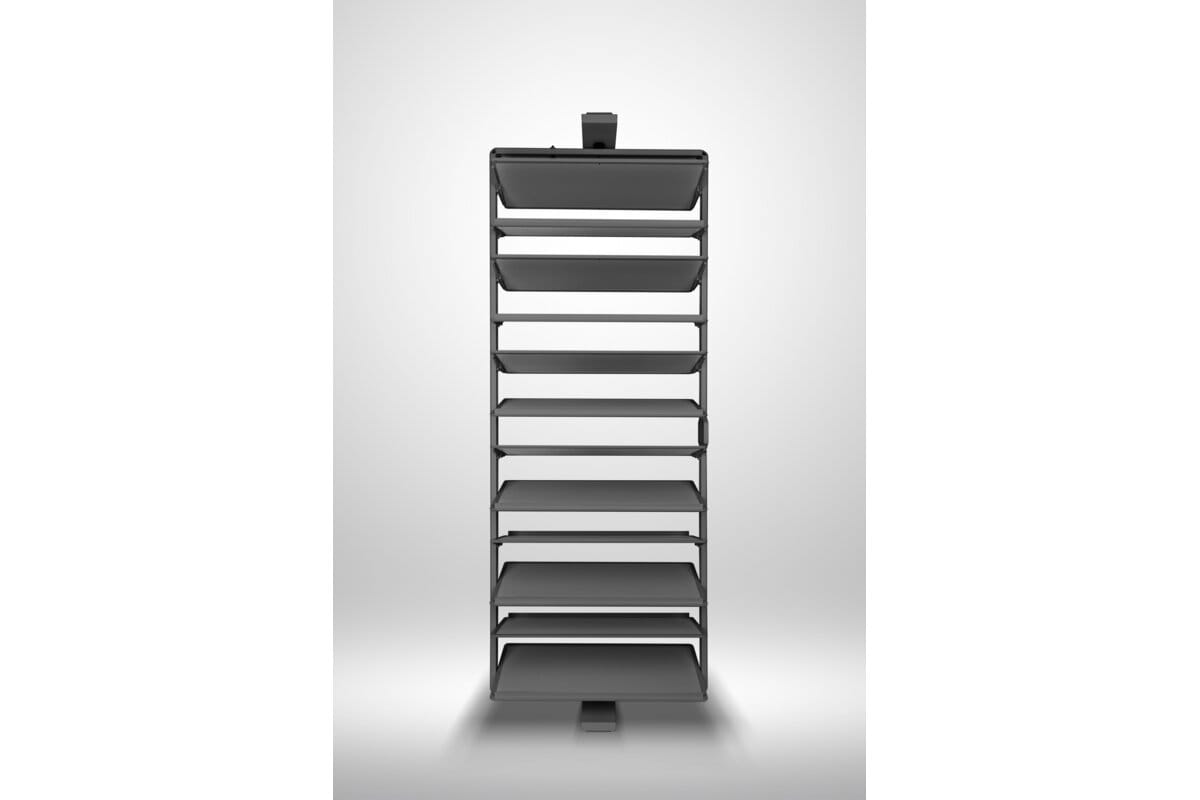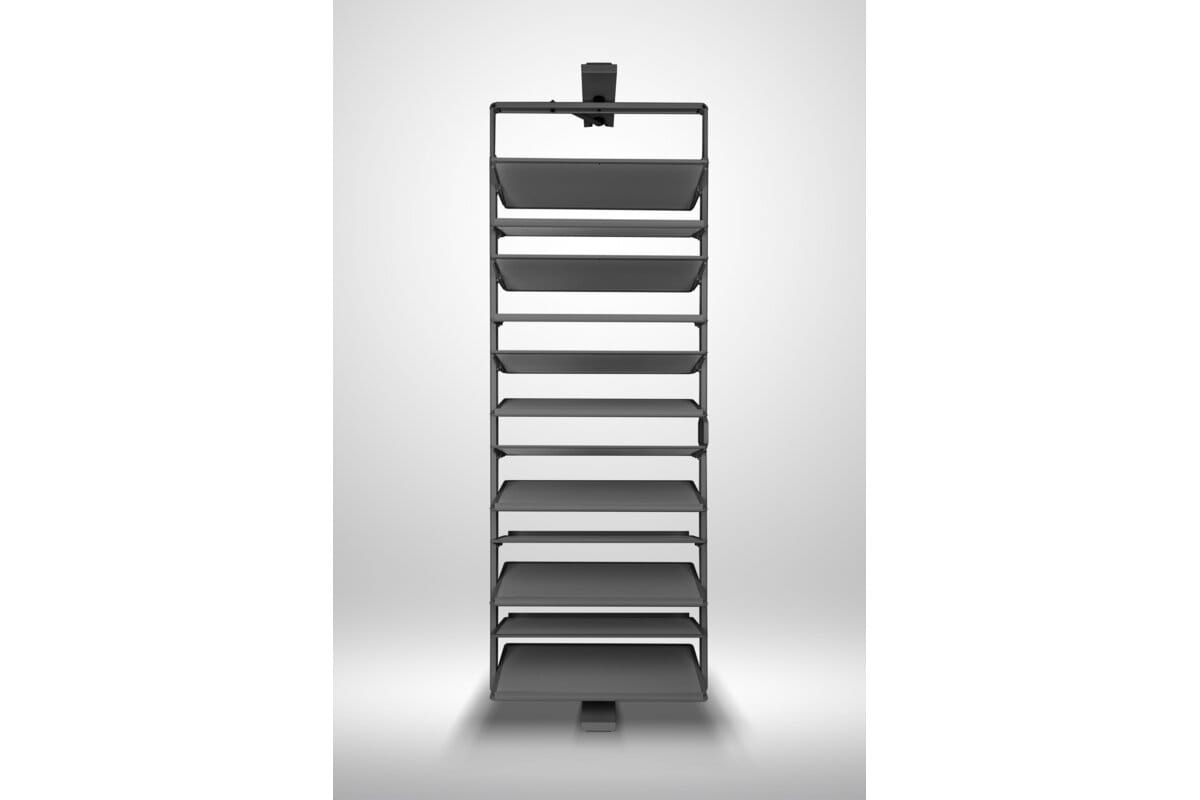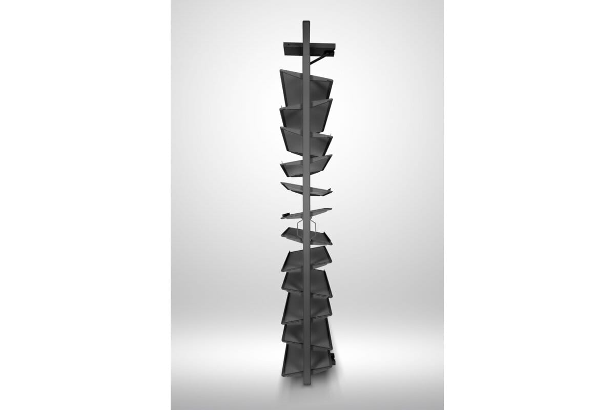 Snúanlegur skórekki með 12 hillum í antrasít. Hentar vel í hærri fataskápa og nýtir plássið vel með snyrtilegri og aðgengilegri skógeymslu.