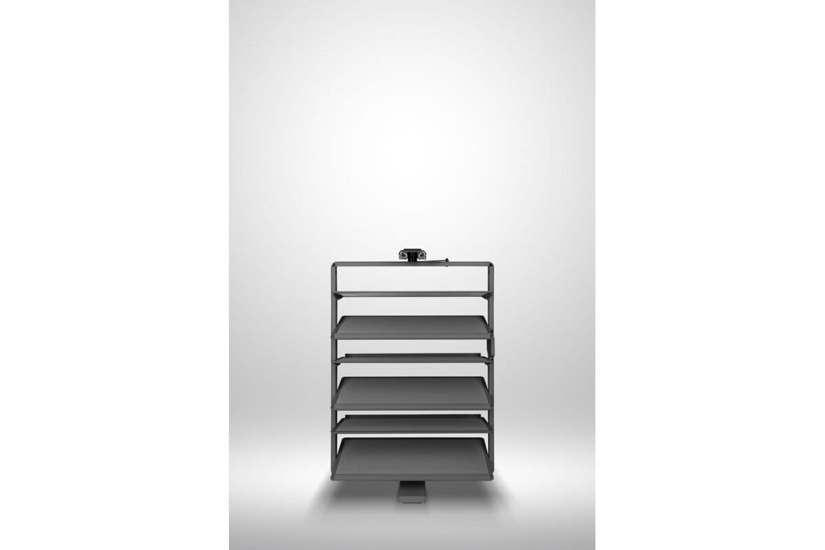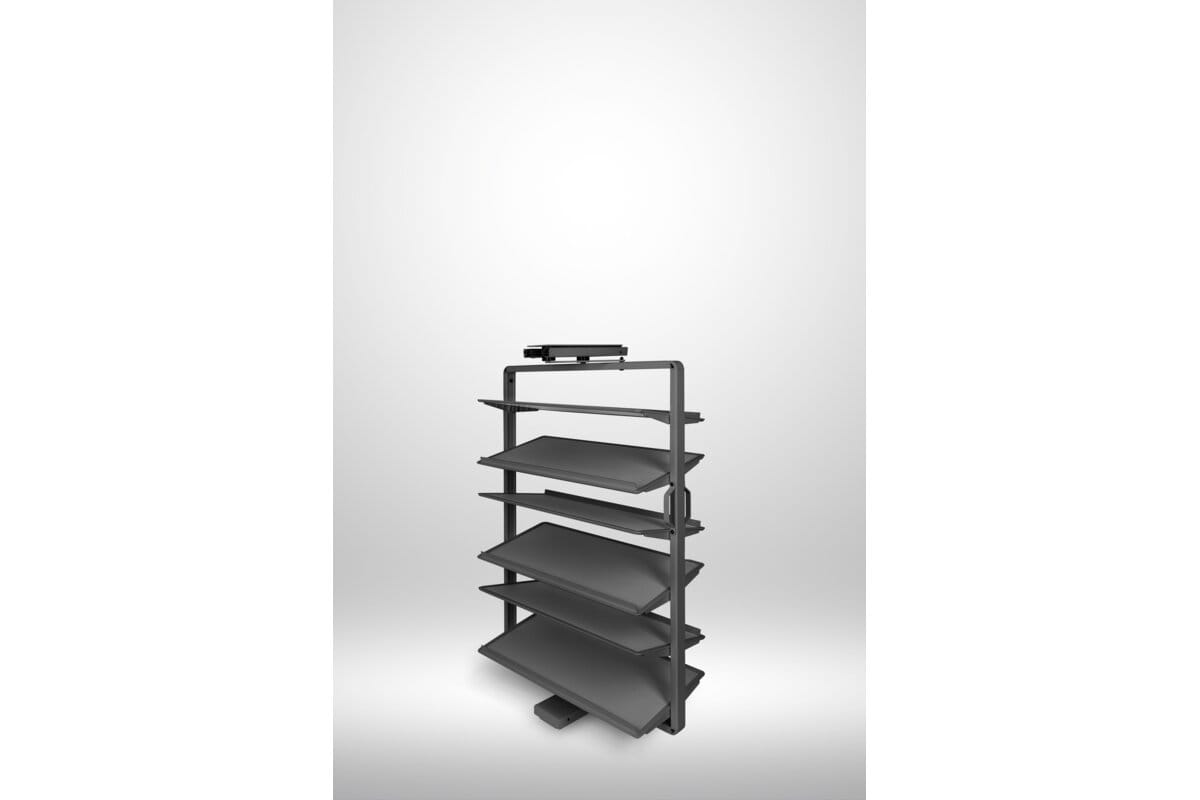 Snúanlegur skórekki með 6 hillum í antrasít. Praktísk og snyrtileg lausn fyrir meðalháa fataskápa með þægilegu aðgengi að skóm.