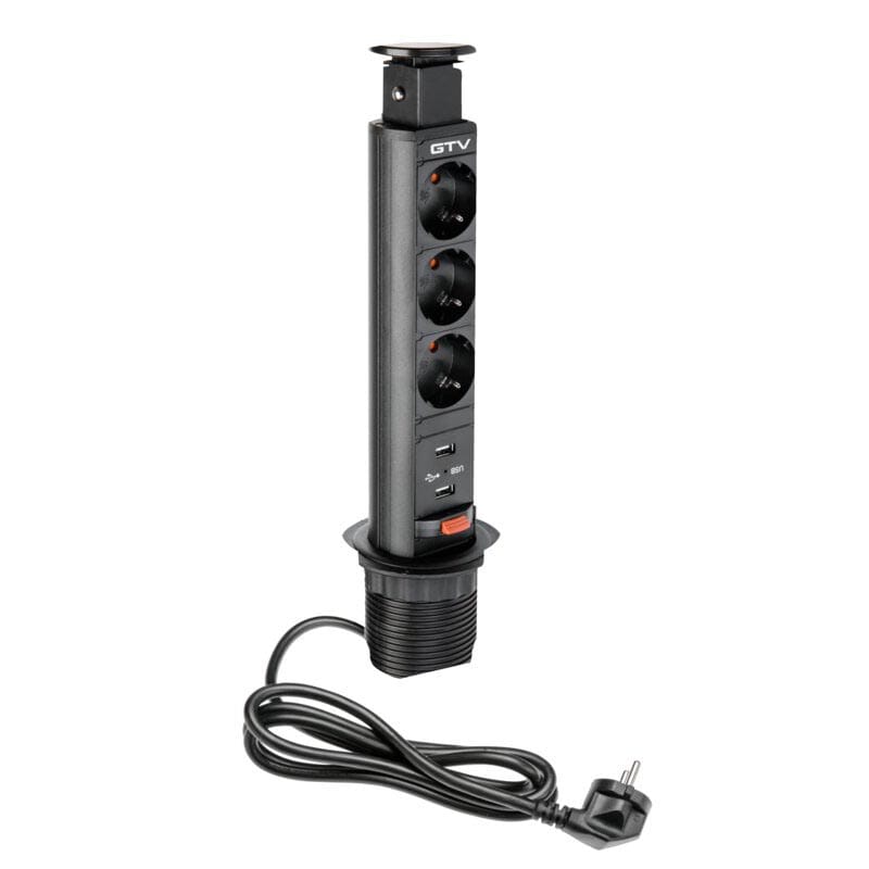 Plásssparandi og snyrtileg útdraganleg tengieining sem fellur niður í borðplötu. Með 3 Schuko-rafmagnstengjum og 2 USB-A hleðslutengjum, hentug fyrir skrifborð, fundarborð og eldhúsbekki. Hentar sérstaklega vel þar sem lítið pláss er til staðar.